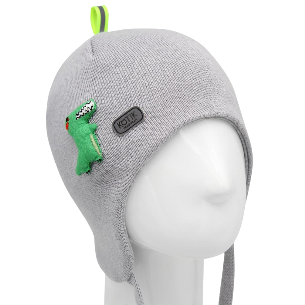 10810 Boys’ Cotton Knit Earflap Hat – 100% Cotton | Fun Green Dinosaur Patch | Lightweight Beanie with Ties for Ages 9-18 M (48-50) | Ideal for Spring & Fall