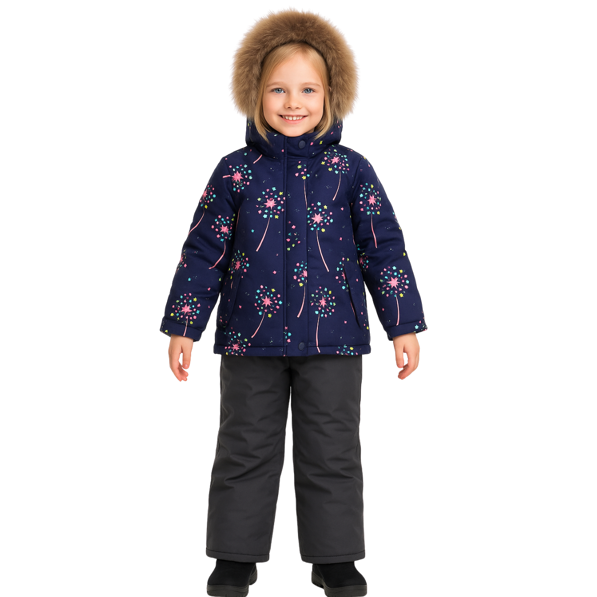 859 Winter Membrane Set for Girls with Natural Fur Hood (Jacket + Snow Bib Pants) | Dandelion Print Design | Sizes 110–134 (5–9 Years) | Up to −30°C (−22°F)