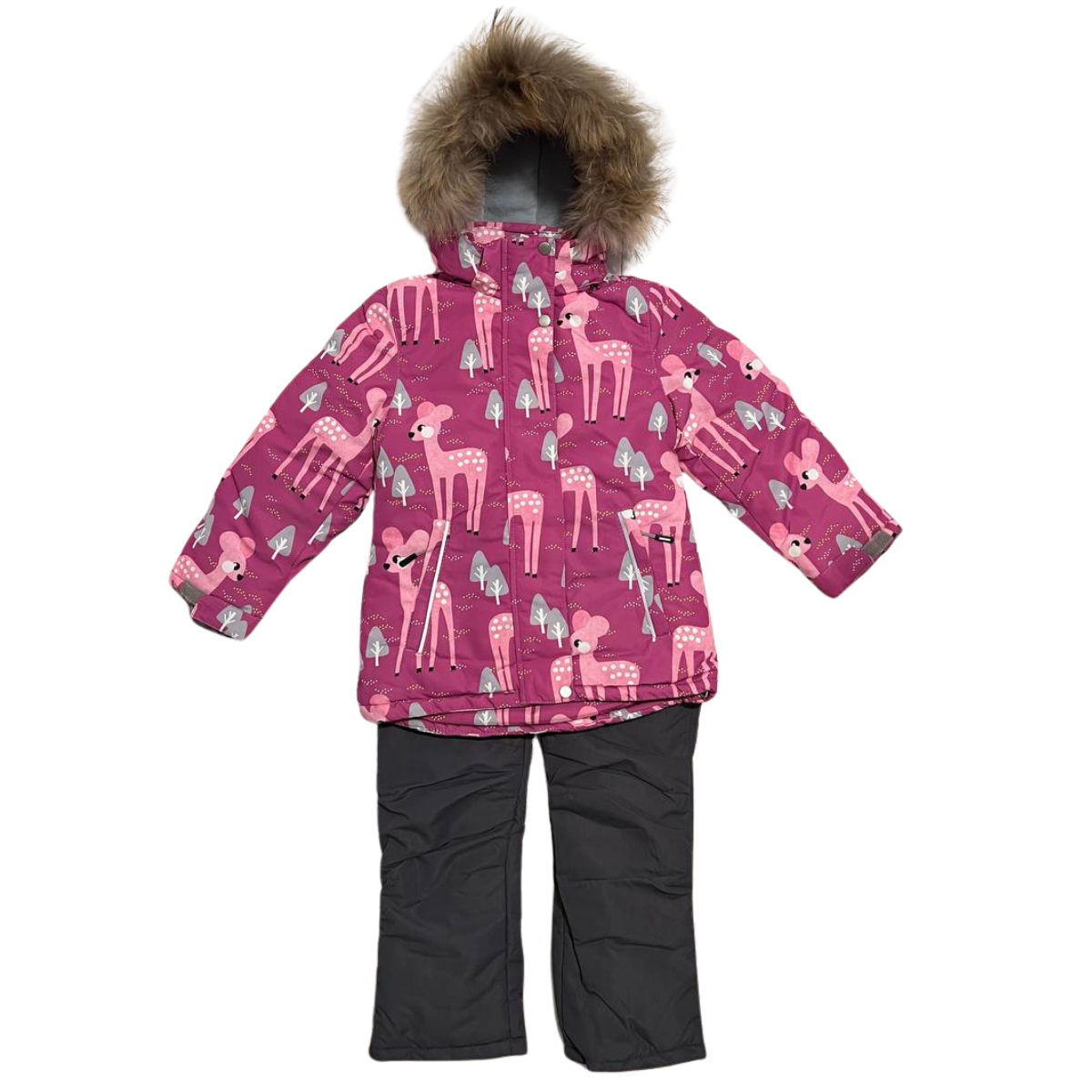 850 Winter Membrane Set for Girls with Natural Fur Hood (Jacket + Snow Bib Pants) | Deer Print Design | Sizes 122–146 (6–11 Years) | Up to −30°C (−22°F)