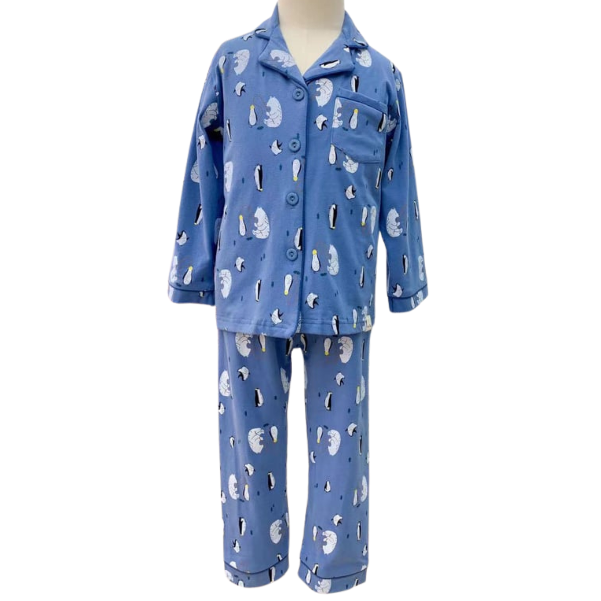 It includes a long-sleeve button-up shirt and full-length pants, both crafted from soft breathable cotton with a playful print.