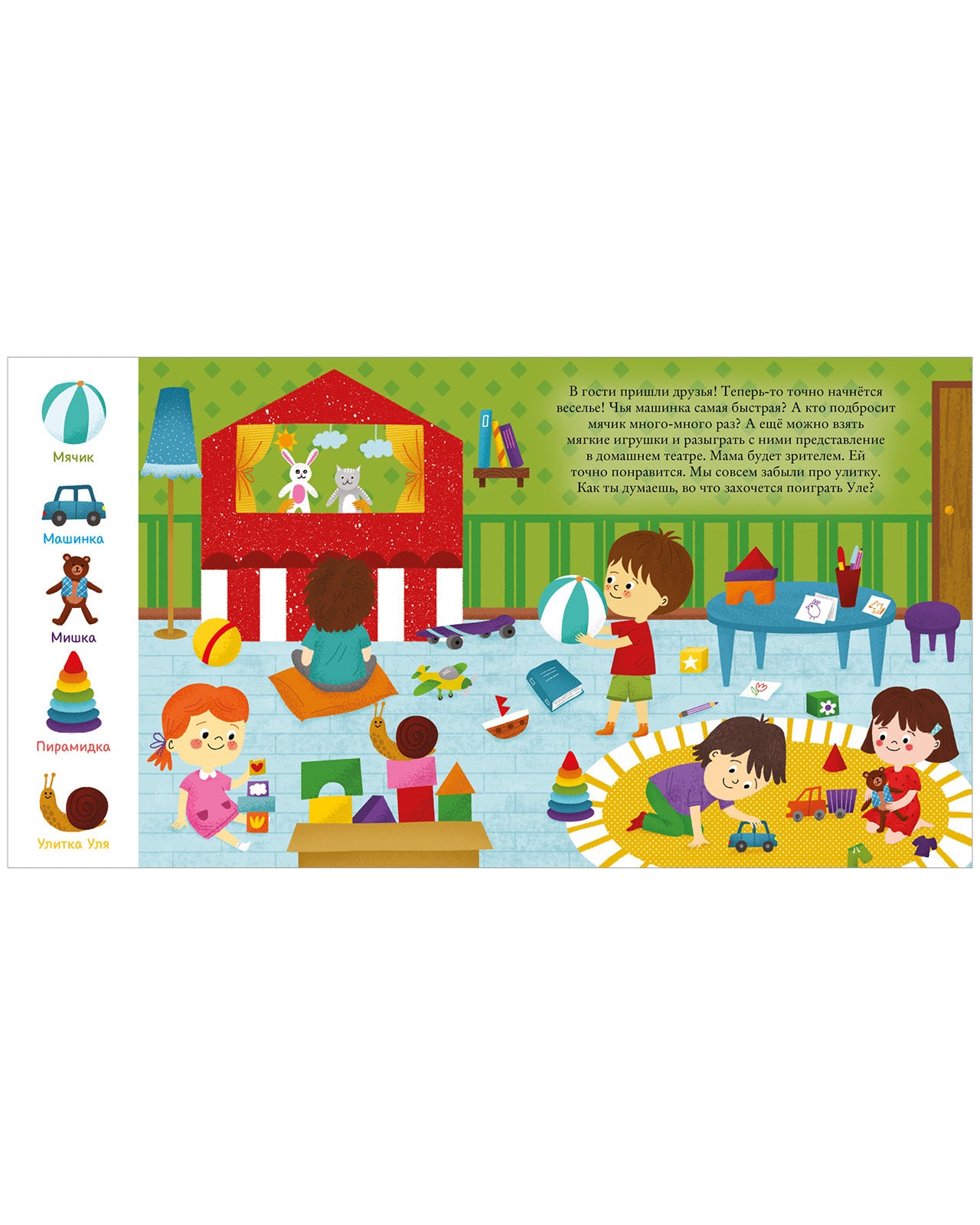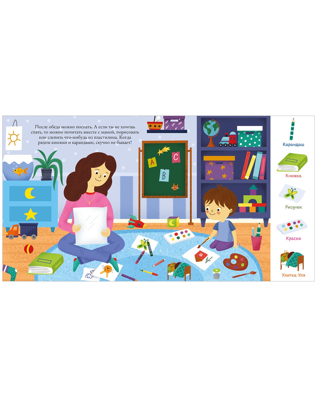 Each page features bright panoramic illustrations and simple text that guides kids through everyday activities — brushing teeth, having breakfast, playing, and going to bed — while developing attention, logic, and memory.