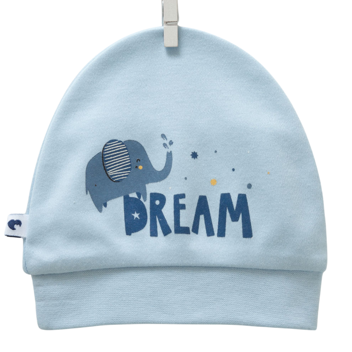 8570 Lightweight Cotton Baby Hat for Boys – Blue Elephant "Dream" Print | Single Layer | 100% Cotton | Sizes 0–9 Months | Caramell (Turkey)