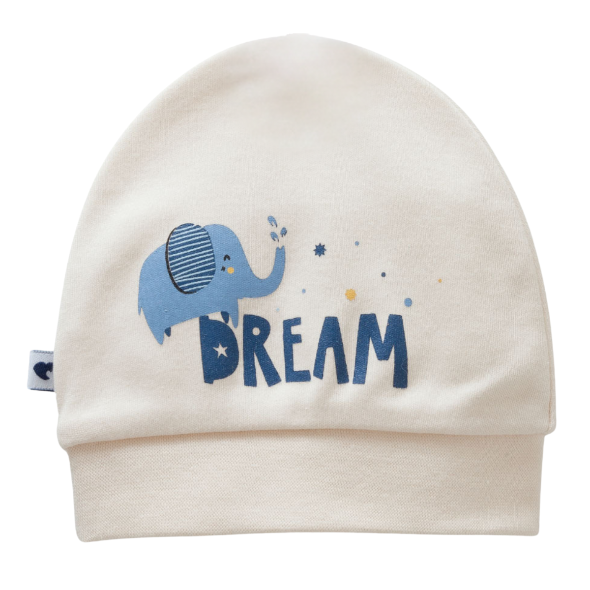 8570 Lightweight Cotton Baby Hat for Boys – Blue Elephant "Dream" Print | Single Layer | 100% Cotton | Sizes 0–9 Months | Caramell (Turkey)