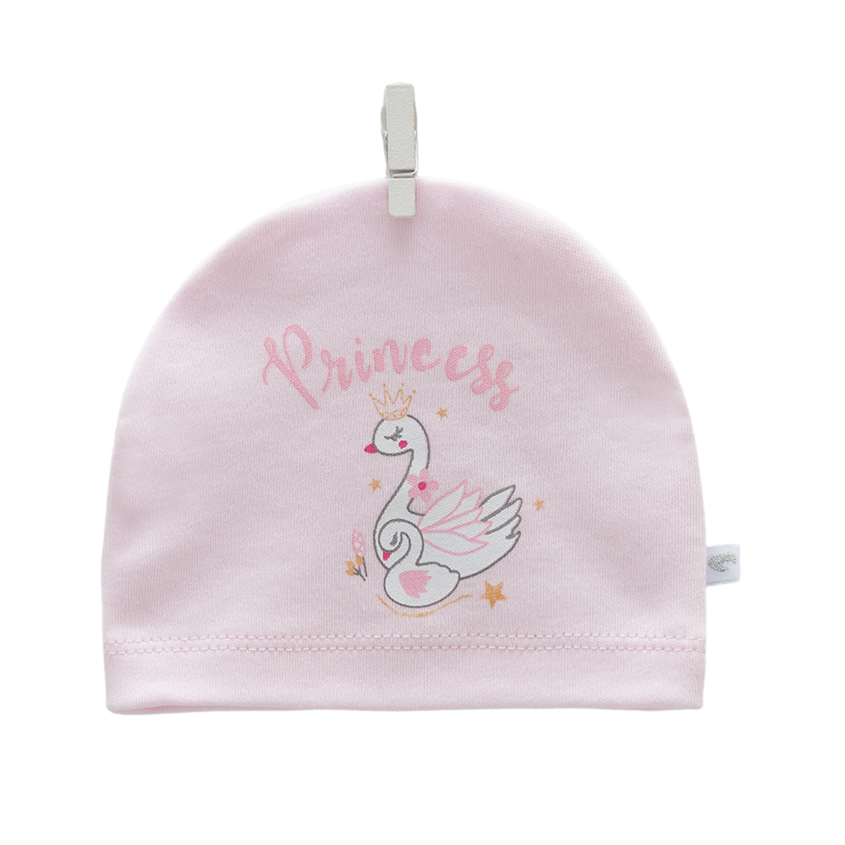 8215 Lightweight Cotton Baby Hat for Girls – Princess Swan Print | Single Layer | 100% Cotton | Sizes 0–9 Months | Caramell (Turkey)