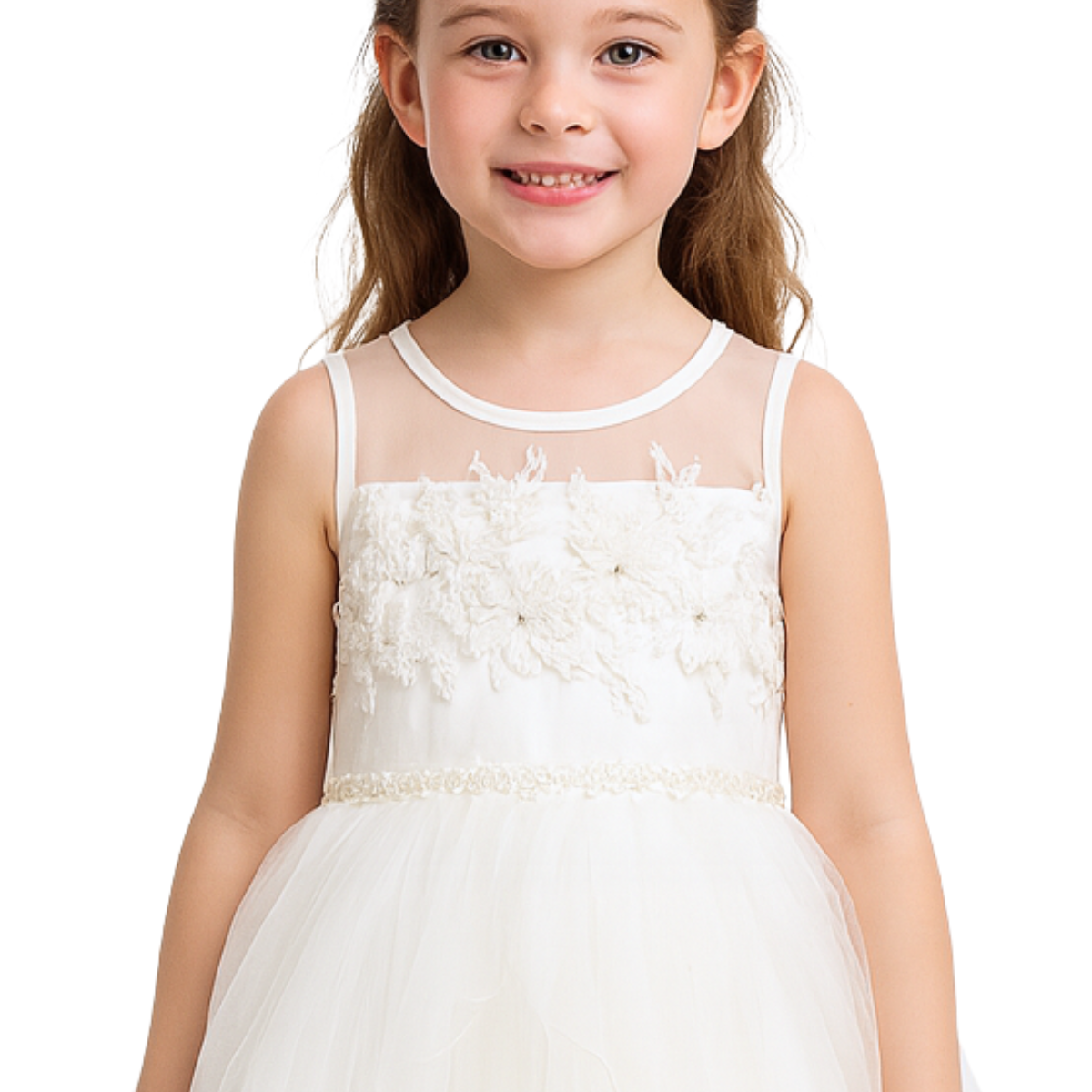 This luxurious Rodeng princess gown is designed for little girls who love elegance, softness, and a true fairytale silhouette. The dress features a beautifully embroidered floral lace bodice, a delicate illusion neckline, and a voluminous multi-layer tulle skirt that moves gracefully with every step.