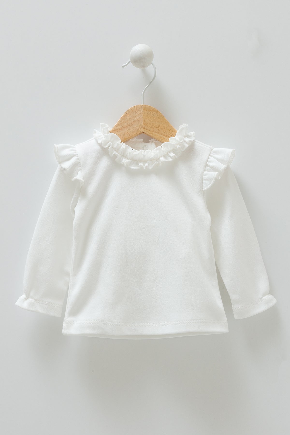 • A long-sleeve bodysuit with a stylish plaid pinafore design and ruffle-trimmed pockets,