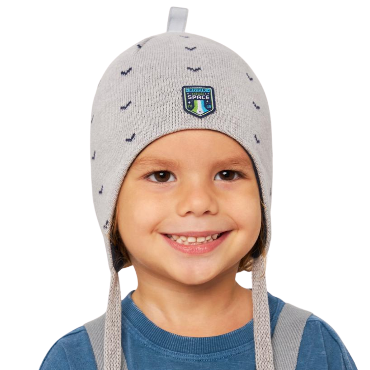 10597 Boys’ Cotton Knit Earflap Hat – Space Explorer Badge Design | 100% Cotton Inside & Out | Ages 18-36 M (50–52 cm) | Lightweight Spring/Fall Beanie with Ties